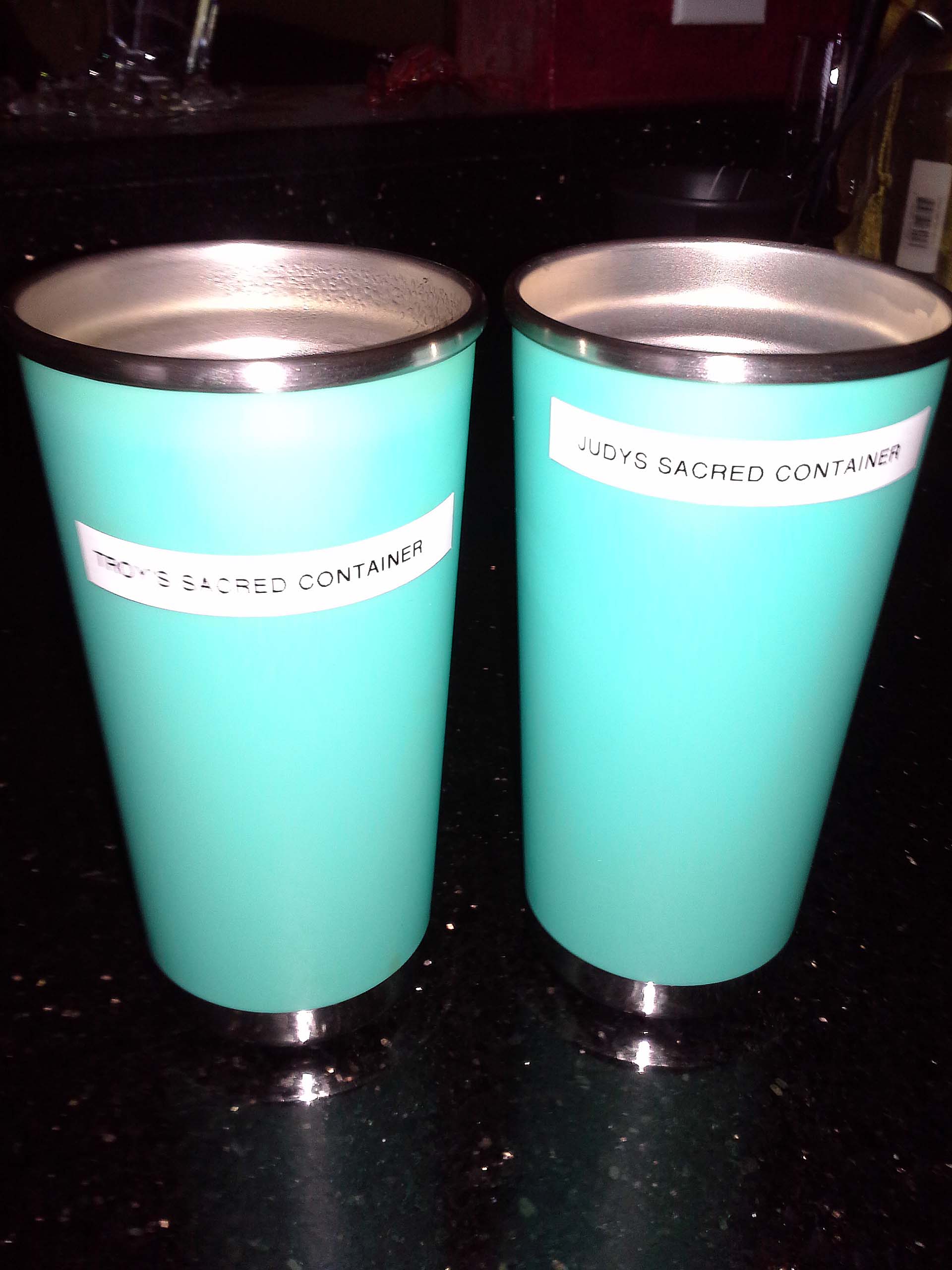 The day before came and Judy decided she wanted to attend. I had learned that a ‘sacred container’ was nothing more than an agreement between the students to be respectful, but I still wasn’t sure about this whole thing. To help break the ice, Judy took two cups and applied labels that said, “Troy’s Sacred Container”, and “Judy’s Sacred Container”, and we headed off to the class.